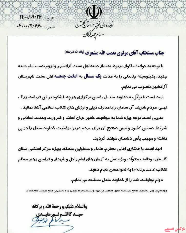 ترکمن سسی - آیت الله نور مفیدی در حکمی مولوی نعمت الله مشعوف را به امامت جمعه اهل سنت آزادشهر منصوب کرد.