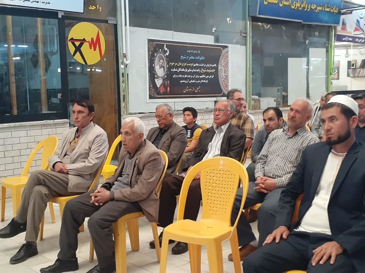 ترکمن سسی - آیین هفتمین روز درگذشت مرحوم جمشید شیخ، فعال عرصه چاپ و نشر با حضور نمایندگان اداره کل فرهنگ و ارشاد اسلامی گلستان، نویسندگان، اهل قلم، فعالان عرصه چاپ و نشر در بازار رضا گرکان برگزار شد.