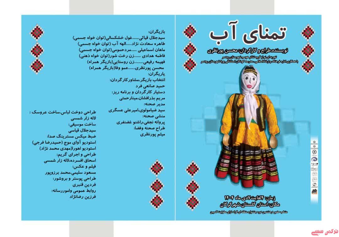 ترکمن سسی - نمایش آیینی ـ خیابانی «تمنای آب» به نویسندگی، طراحی و کارگردانی محسن پورنظری، با نگاهی بومی و مشارکتی به بحران آب، روز جمعه پنجم دی‌ماه در هشتمین جشنواره تئاتر منطقه‌ای افراد دارای معلولیت «کاسپین» در تالار فخرالدین اسعد گرگانی به روی صحنه می‌رود.