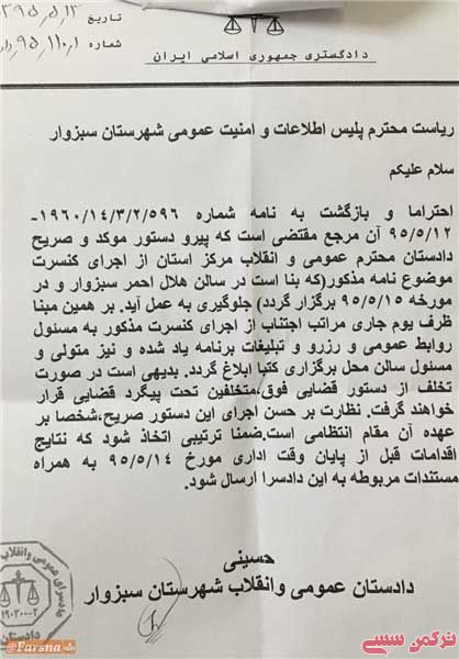ترکمن سسی-در حالی که قرار بود کنسرت سالار عقیلی روز جمعه 15 مردادماه در شهر سبزوار برگزار شود،به دستور دادستانی این شهر لغو شد.
