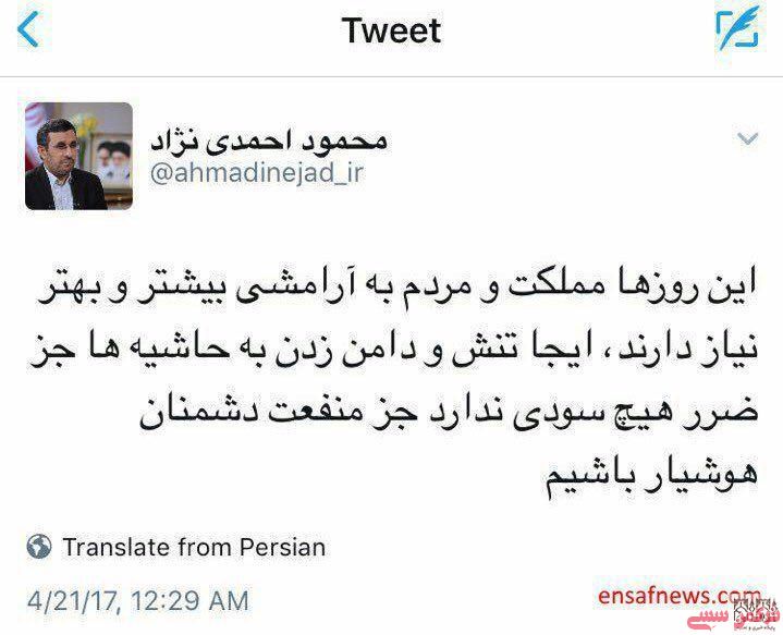 ترکمن سسی - محمود احمدی نژاد رئیس جمهور پیشین ایران شاخص ترین چهره رد صلاحیت شده در شورای نگهبان است .وی با انتشار پیامی در توییتر به این مساله واکنش نشان داد .
