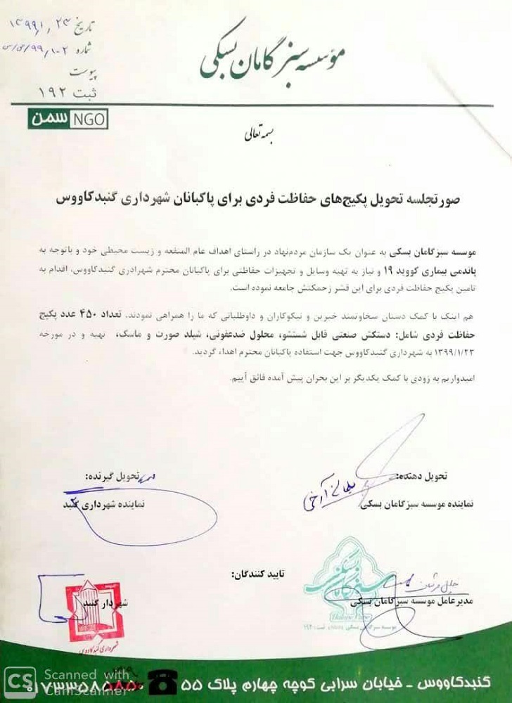 ترکمن سسی - موسسه سبزگامان بسکی به عنوان یک سازمان مردم نهاد ، تعداد ۴۵٠ عدد پکیج حفاظت فردی به پاکبانان شهرداری گنبدکاووس اهدا نمود.