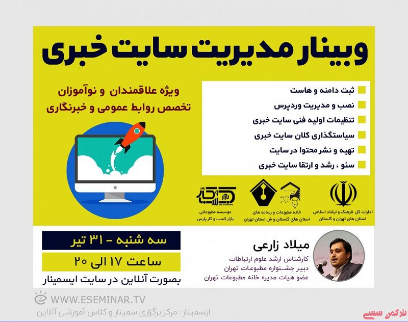 این وبینار زیر نظر «میلاد زارعی» دانش آموخته ی علوم ارتباطات، دبیر جشنواره مطبوعات تهران و عضو هیات مدیره خانه مطبوعات تهران بصورت آنلاین در سایت ایسمینار از ساعت 17 تا 20 برپا می شود.