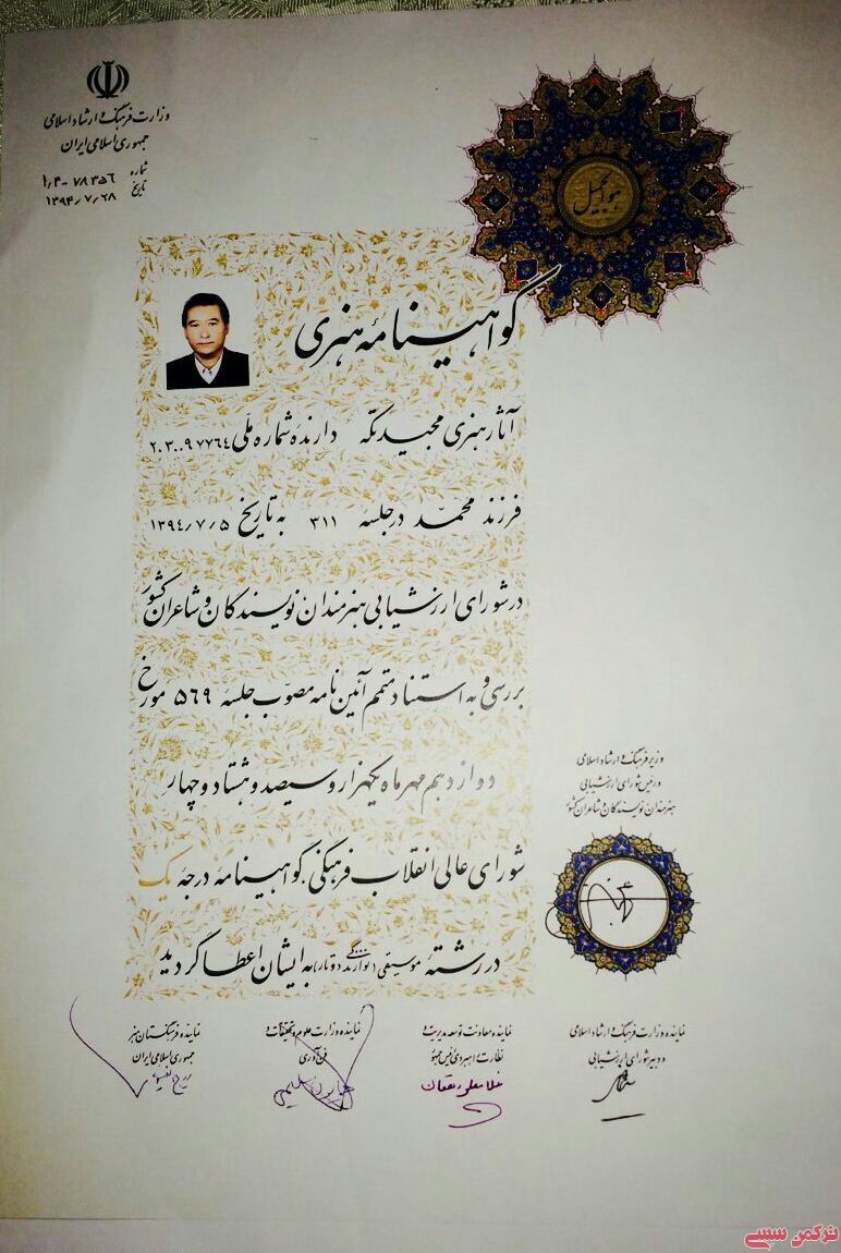 متن گواهینامه هنری دکتر مجید تکه به شرح زیر است: