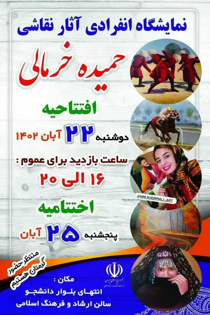 ترکمن سسی - نمایشگاه انفرادی آثار نقاشی هنرمند گنبدی، حمیده خرمالی از دوشنبه ۲۲ آبان تا پنج شنبه ۲۵ آبان در شهر گنبدکاووس، انتهای بلوار دانشجو، سالن اداره فرهنگ و ارشاد اسلامی گنبدکاووس، برای بازدید عموم علاقمندان دایر است.