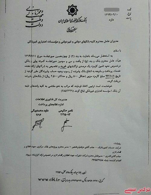 در دستورالعمل بانک مرکزی آمده است: « با توجه به بند سوم از چهاردهمین صورت جلسه یازدهم شهریورماه امسال هیأت عامل بانک و بند «ج» از یکصد و سی و سومین صورت جلسه کمیته پولی و بانکی درباره چگونگی تأمین کارمزد یک درصدی تراکنش های خرید و تخصیص به شرکت های ارائه دهنده خدمات پرداخت و با توجه به انتفاع بانک پذیرنده از رسوب وجوه حساب پذیرندگان مقرر شد از اول دیماه 94 مبلغ کارمزد یادشده از بانک های پذیرنده دریافت شود».