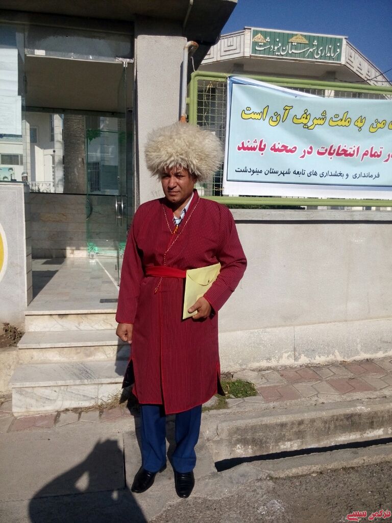 ترکمن سسی- یکی از کاندیداهای شرق استان در اقدامی جالب با لباس محلی ترکمنها در محل فرمانداری مینودشت حاضر شد تا در حوزه ی انتخابیه کلاله ثبت نام کند.