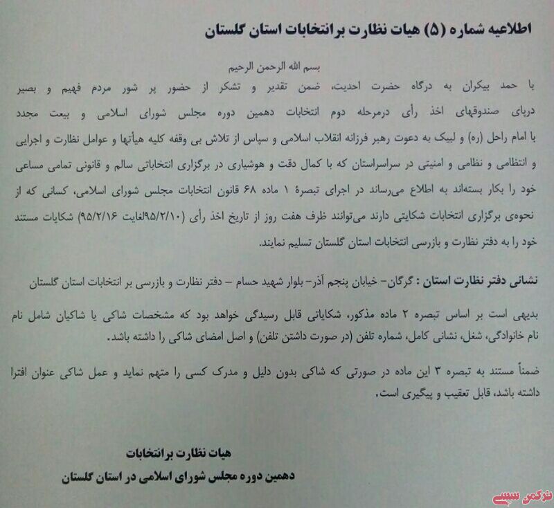 ترکمن سسی-هیئت نظارت بر انتخابات استان گلستان اطلاعیه شماره 5 خود را اعلام کرد.