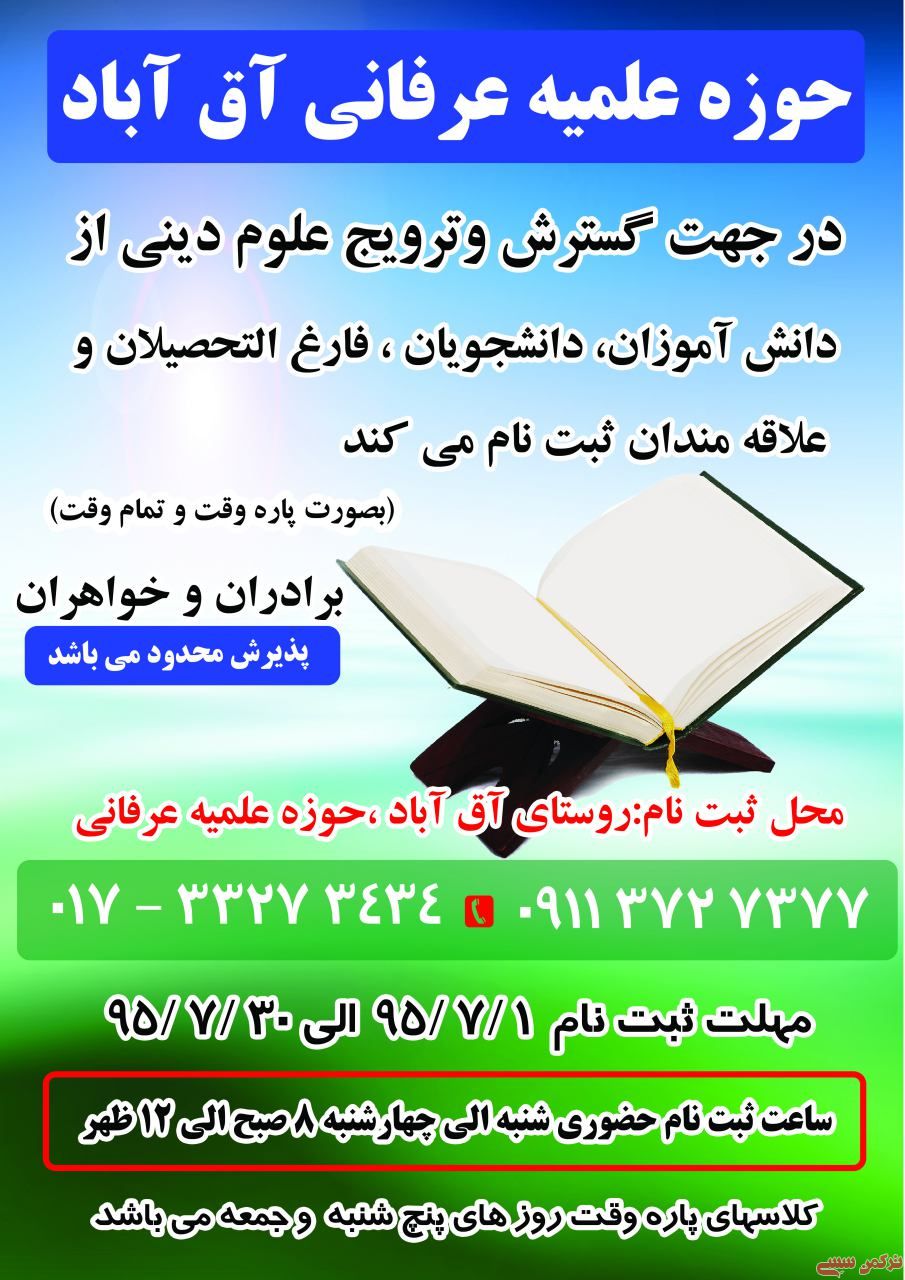 به گزارش خبرنگار ترکمن سسی،حوزه علمیه عرفانی اهل سنت روستای آق آباد گنبدکاووس در جهت ترویج و گسترش علوم دینی از دانش آموزان،دانشجویان،فارغ التحصیلان و علاقمندان ثبت نام می کند.