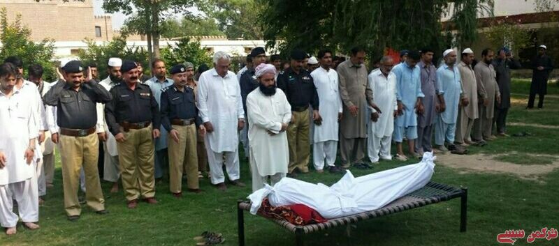 ترکمن سسی-یکی از علمای اهل سنت پاکستان بر پیکر پلیس شیعه‌ای که در راه محافظت از حسینیه منطقه بنون به شهادت رسید نماز اقامه کرد.