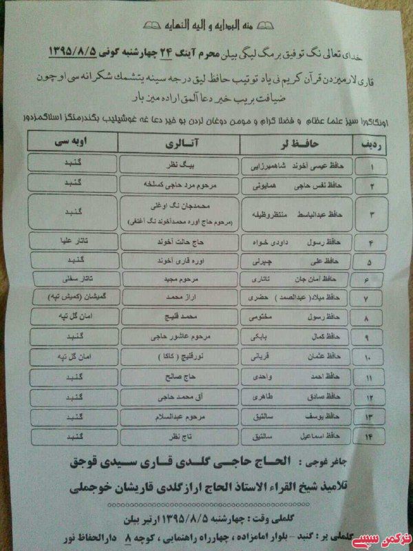 این مراسم در گنبدکاووس،بلوار امامزاده،چهارراه راهنمایی کوچه هشت در دارالتحفیظ نور برگزار می شود.