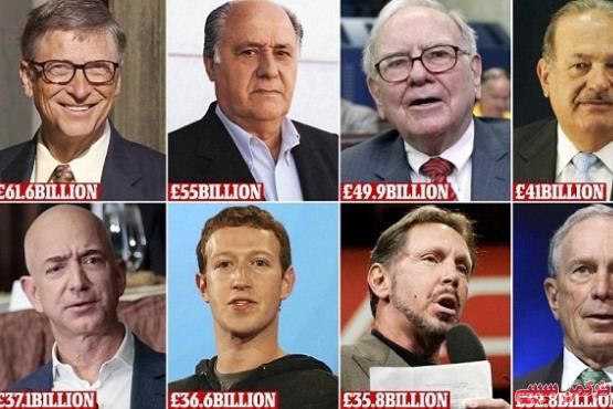 به گزارش خبرنگار ترکمن سسی به نقل از دیلی میل،بیل گیتس با 61.6 میلیارد پوند، امانکیو اورتگا با 55 میلیارد پوند، وارن بافت با 49.9 میلیارد پوند، کارلوس اسلیم هلو با 41 میلیارد پوند، جف بزوس با 37.1 میلیارد پوند، مارک زاکربرگ با 36.6 میلیارد پوند، لری الیسون با 35.8 میلیارد پوند و مایکل بلومبرگ با 32.8 میلیارد پوند ثروتمندترین افراد جهان هستند. این هشت نفر روی یکدیگر نیمی از ثروت موجود در دنیا را در اختیار دارند.