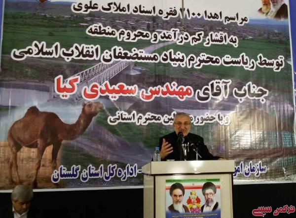 به گزارش ایرنا، مراسم واگذاری اسناد مالکیت 30 میلیون و 900 هزار مترمربع از اراضی زراعی و مسکونی متعلق به بنیاد مستضعفان انقلاب اسلامی به صورت رایگان به مرزنشینان استان گلستان در قالب 2100 فقره سند مالکیت، روز چهارشنبه با حضور محمد سعیدی کیا رئیس این سازمان و مسئولان استانی و شهرستانی در روستای مرزی کرند از توابع شهرستان گنبدکاووس برگزار شد.