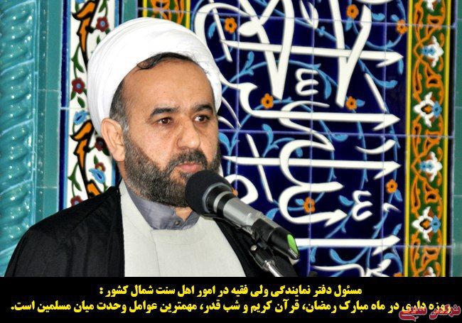 مسئول دفتر نمایندگی ولی فقیه در امور اهل سنت شمال کشور تصریح کرد : عامل سوم وحدت، شب قدر است. همه مسلمین بر عظمت شب قدر و فرصت استثنایی آن آگاهند و جدای از تعیین زمان آن بین شبهای 21 و 23 که اغلب عقیده شیعه بر آن است و نیز شب 27 که به اعتقاد اهل سنت است، در حقیقت و اصل وجود آن اختلافی نیست و بنابراین پیروان اهل سنت و شیعه میتوانند به امید نیل به فیض شب قدر ، هر سه شب 21 و 23 و 27 را به تهجد بگذرانند و مجالس احیا را مشترک برگزار کرده و ادعیهای چون قرآن بر سر گرفتن، مجیر، جوشن کبیر و ... به طور جمعی زمزمه کنند.