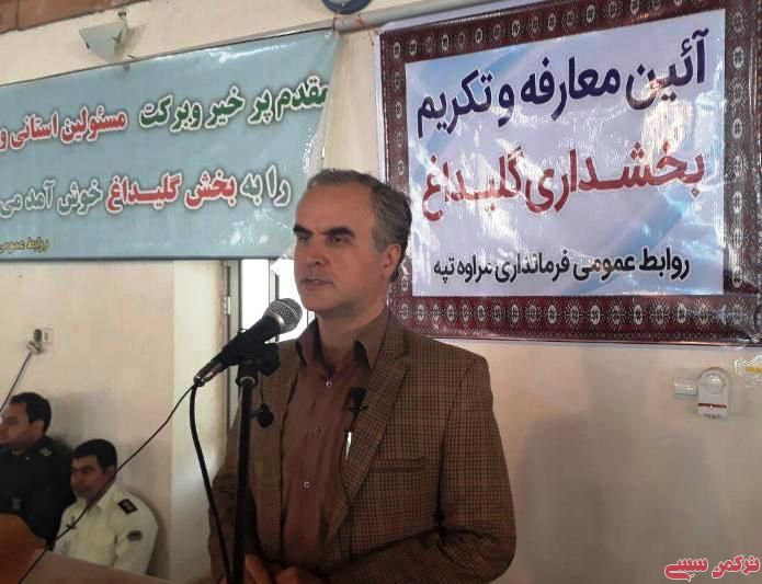 در این آیین فرماندار مراوه تپه نیز با تاکید بر بهره گیری از جوانان توانمند و متعهد در بخش های مختلف اداری و اجرایی ادارات و نهادها گفت: امروز در آیین تودیع و معارفه دو نفر از فرزندان تلاشگر، متعهد و بومی این منطقه به عنوان بخشدار گلیداغ این شهرستان شرکت داریم.