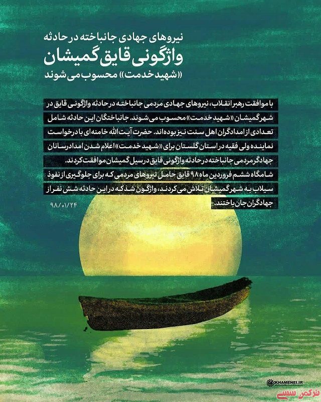 ترکمن سسی - با موافقت رهبر انقلاب، نیروهای جهادی مردمی جانباخته در حادثه واژگونی قایق در شهر گمیشان «شهید خدمت» محسوب میشوند. جانباختگان این حادثه شامل تعدادی از امدادگران اهل سنت نیز بودهاند.