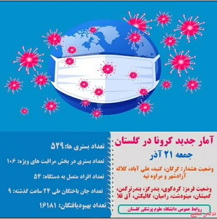 وی خاطرنشان کرد: در حال حاضر۵۲۹ بیمار مبتلا به کرونا در بیمارستان های استان بستری اند، که این عدد نسبت به هفته قبل با کاهش چشمگیری مواجه شده است،  از این تعداد ۱۰۶بیمار در بخش مراقبت های ویژه و ۵۴ بیمار به دستگاه ونتیلاتور متصل اند، همچنین تاکنون ۱۶ هزار و ۱۸۱ فرد مبتلا به کرونا در استان بهبود یافته اند و متاسفانه طی ۲۴ ساعت گذشته ۹ فوتی بر اثرکرونا در گلستان ثبت شد
