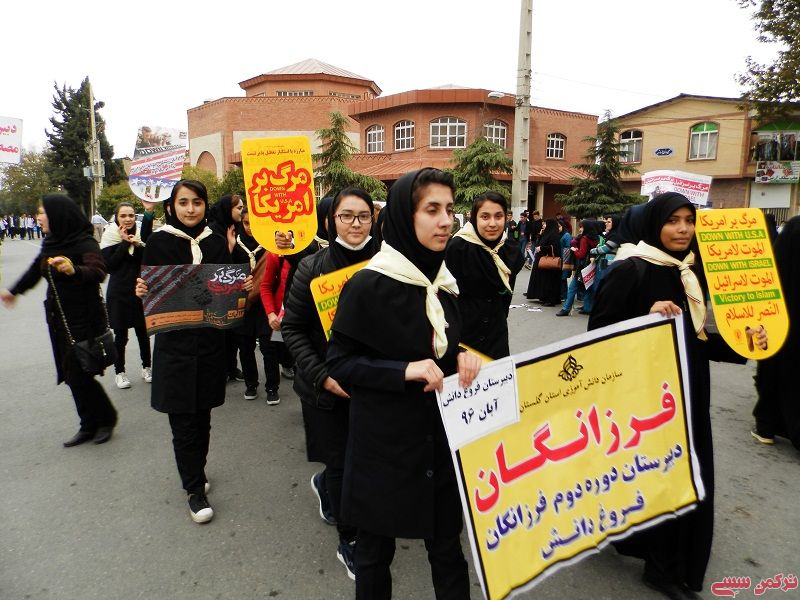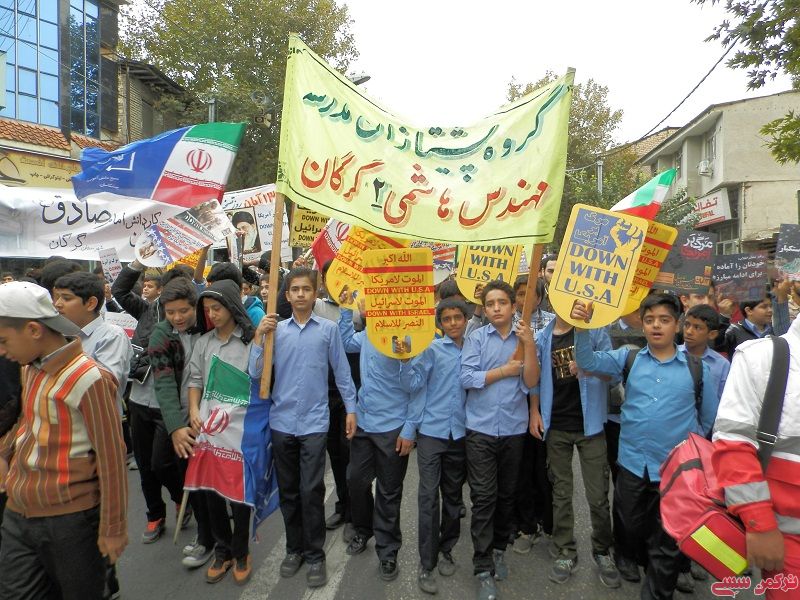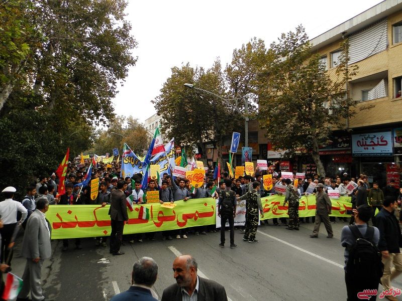 تركمن سسي – مردم انقلابي سراسر استان گلستان همنوا و همگام با سراسر ميهن اسلامي ايران ،در روز 13 آبان ماه نمايش عظيم عزت خواهي و قدرتمندي نظام مقدس اسلامي در برابر زياده خواهيهاي استكبار جهاني به رهبري آمريكاي جنايتكار و تجديد عهد و ميثاق با آرمانهاي شهداءوامام خميني (ره)و منويات مقام معظم رهبري (مدظلهالعالي) را به تصوير كشيدند.