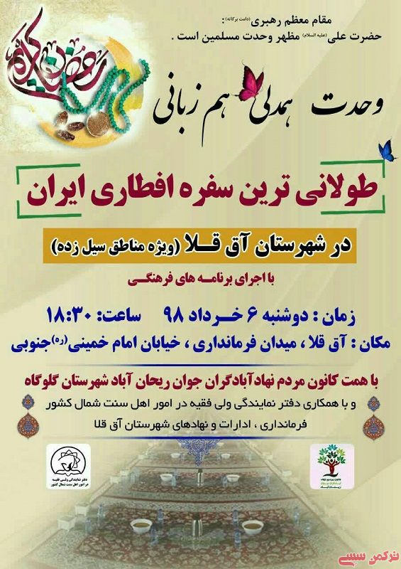 به گزارش پایگاه خبری ترکمن سسی ، این سفره با شعار " وحدت ، همدلی ، همزبانی" با همت کانون مردم نهاد آبادگران جوان ریحان آباد شهرستان گلوگاه و با همکاری دفتر نمایندگی ولی فقیه در امور اهل سنت شمال کشور ( مرکز بزرگ اسلامی شمال کشور) از ساعت 18:30 امروز دوشنبه 6 خردادماه در شهر آق قلا ، میدان فرمانداری ،خیابان امام خمینی (ره) جنوبی برپا می شود.