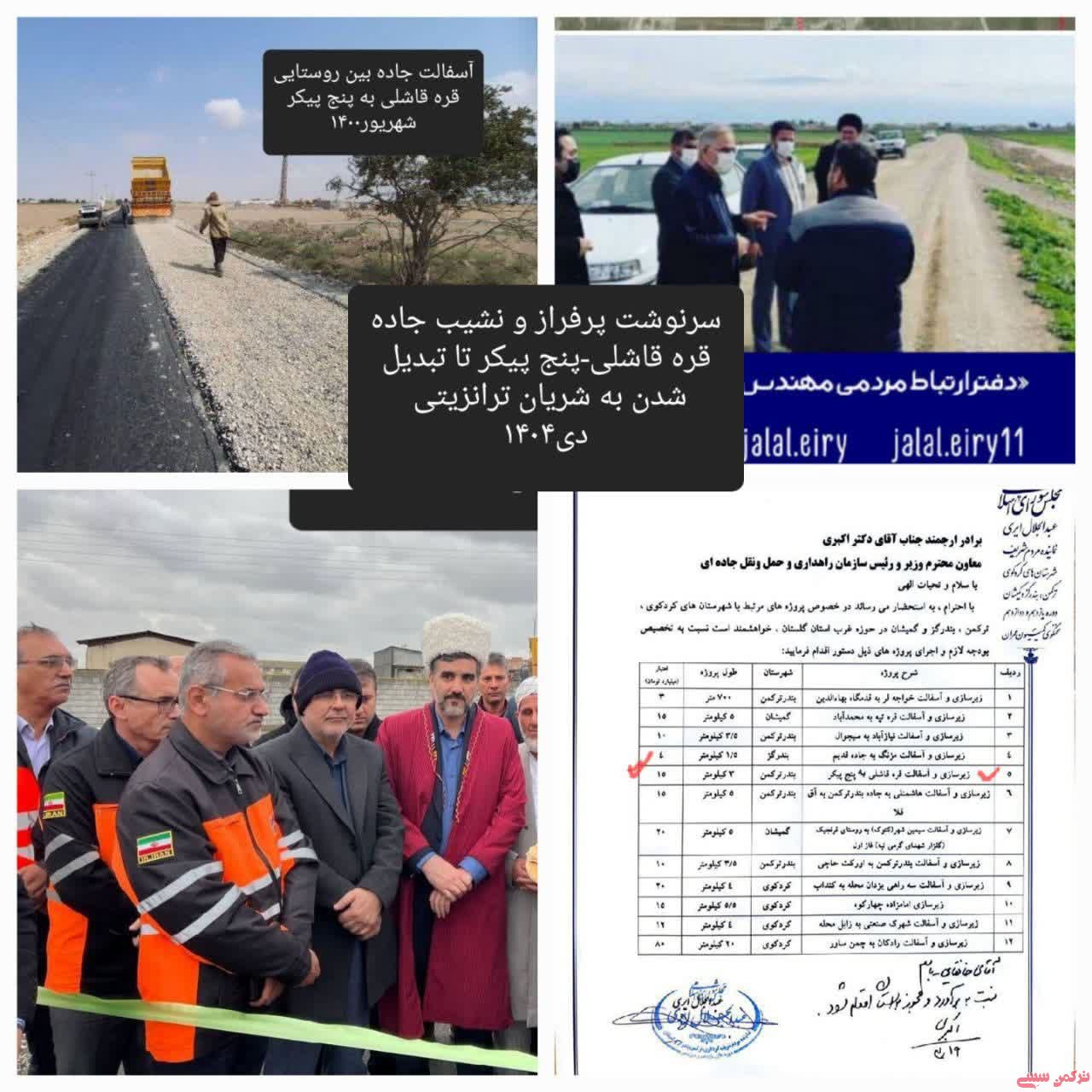 ترکمن سسی - عبدالستار کم : مسیر ارتباطی روستای قره قاشلی به پنج پیکر، که به دلیل مقاومت مسئولان شهرک صنعتی در عبور از میان آن، سالها معطل مانده بود، سرانجام با پیگیری عبدالجلال ایری، سخنگوی کمیسیون عمران مجلس، در بودجه 1400 تعریف و در تابستان همان سال به بهرهبرداری رسید.